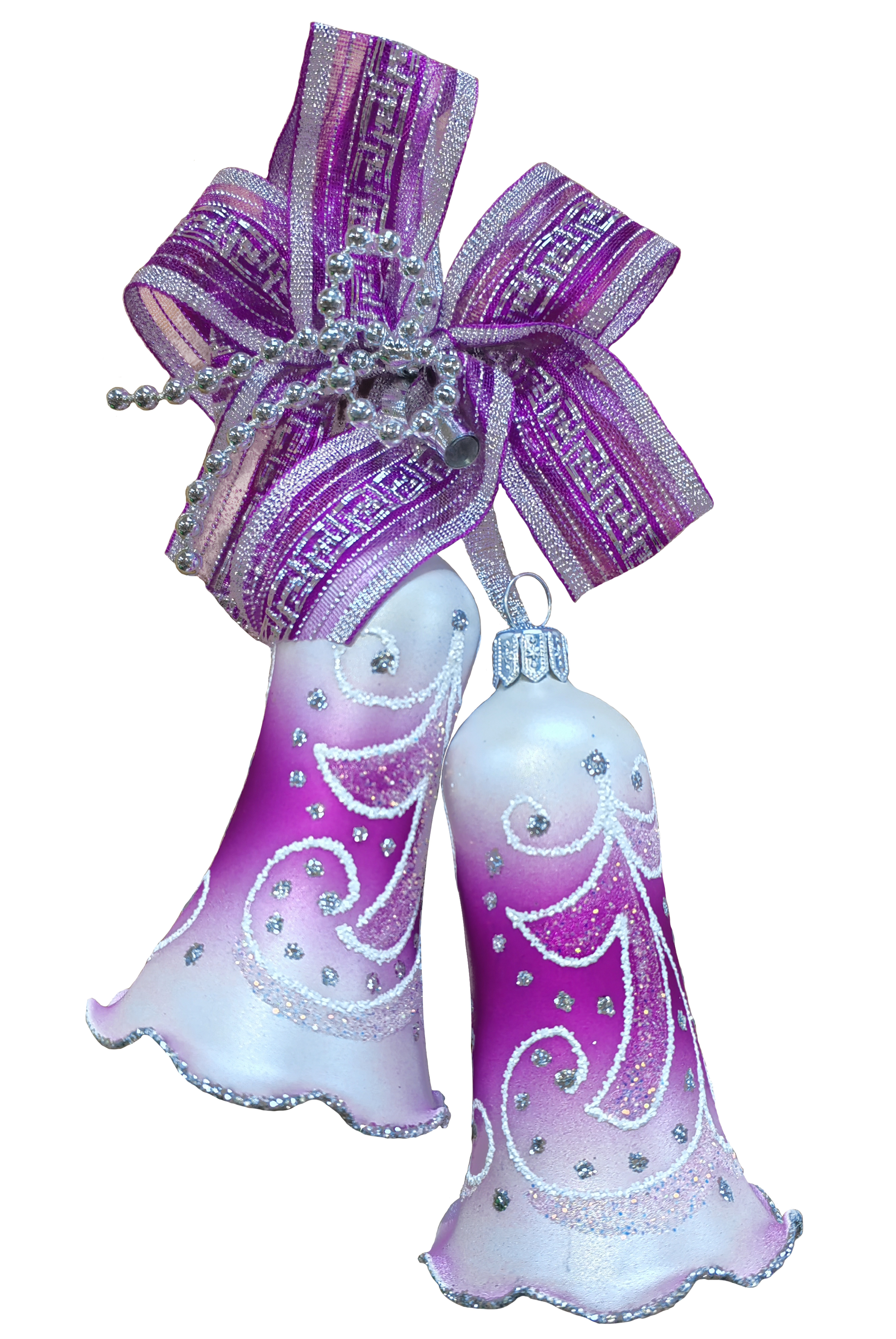 Красивые колокольчики в наборе пара. Украшены незаурядным узором, низ колокольчика сделан, словно волнистая юбочка, по кромке обсыпанная блестками. Связочка украшена декоративным бантиком и ленточкой. Украшение для удобства имеет ушко для ниточки или крючка. Размер колокольчиков 8,5 см. В индивидуальной упаковке.
