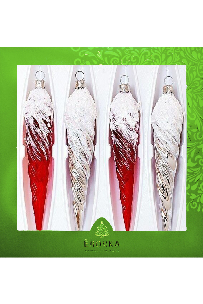 Набор из 4-х сосулек из стекла. Украшения покрыты особой голографической обсыпкой, поэтому невероятно ярко блестят, переливаясь в бликах огоньков. Украшение для удобства имеет ушко для ниточки или крючка. Размер 9,5см. В индивидуальной упаковке. Цвета в ассортименте.