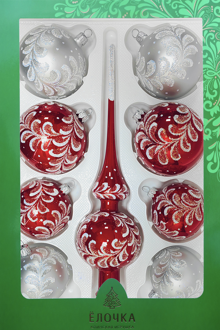 Изящный, нарядный набор из макушки и 8 шариков. Размер макушки 28 см, диаметр шаров 6-8,5 см. Словно иней на стекле, украшены узорами игрушки, обсыпаны блестящей крошкой. Им можно украсить елочку макушку и веточки. Такой набор можно преподнести в новогодние праздники и в подарок. Украшение для удобства имеет ушко для ниточки или крючка. В индивидуальной упаковке. Цвета в ассортименте.