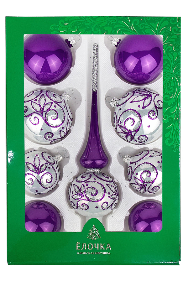 Прекрасный набор из 9 предметов: 8 шариков и макушки. Диаметр 4 шаров по 6 см и 4 шаров по 8,5 см, макушка 28 см. Классический цвет шариков и макушка великолепно дополнит декор вашей елочки. В индивидуальной упаковке. Цвета в ассортименте. Украшения декорированы росписью, переливающейся крошкой (в зависимости от вида). В индивидуальной упаковке. Цвета в ассортименте.