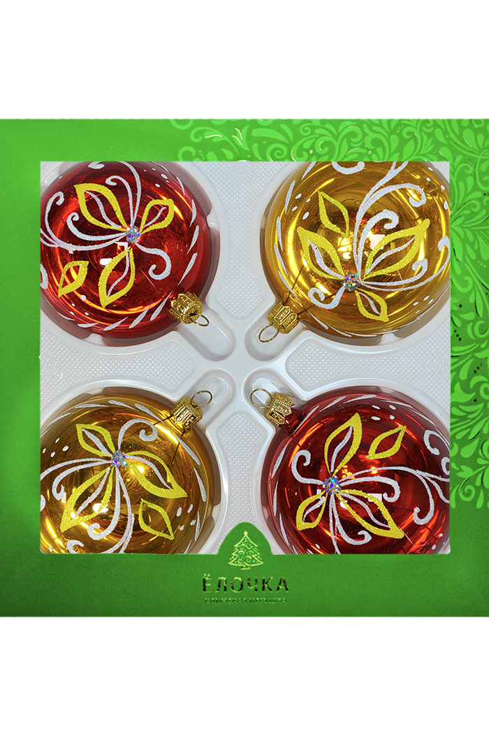 Набор из 4 шаров 7,5 см из стекла. Украшения декорированы росписью, переливающейся крошкой (в зависимости от вида). В индивидуальной упаковке.