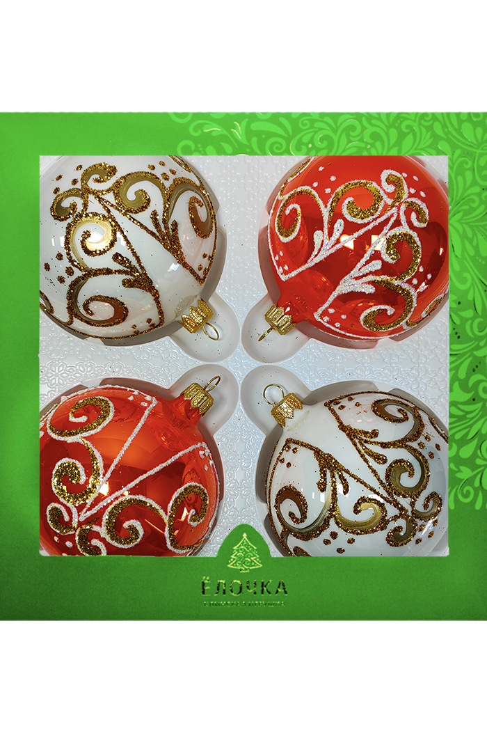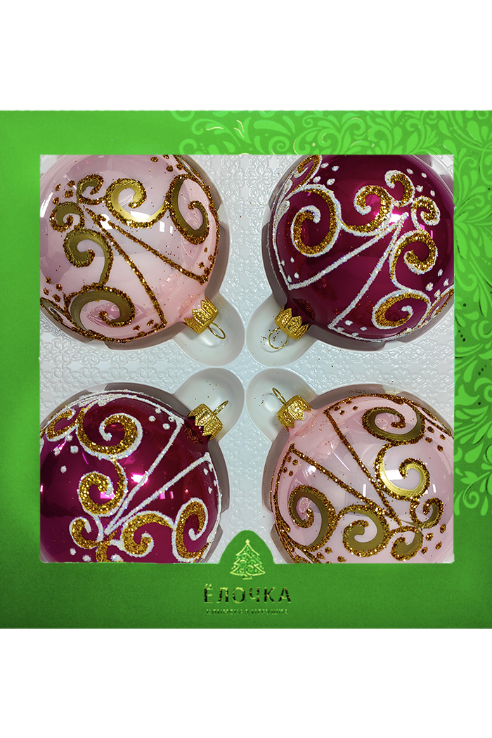 Набор из шаров из стекла. В индивидуальной упаковке. Украшения декорированы росписью, переливающейся крошкой (в зависимости от вида). Диамет шаров 8,5 см.
