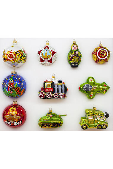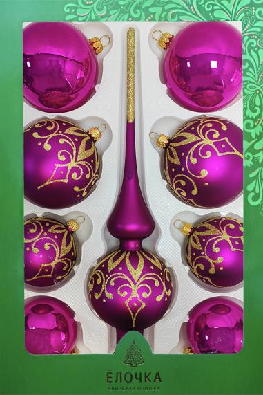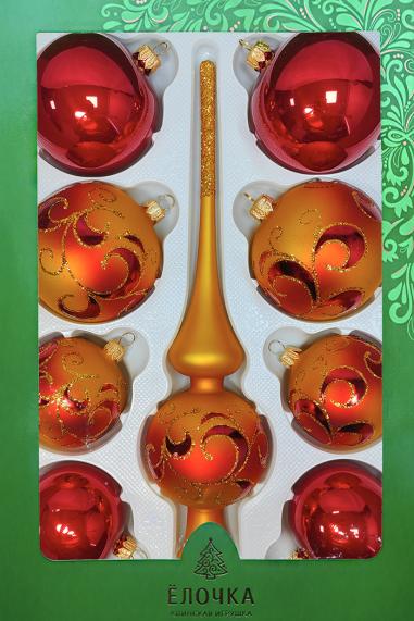 Набор из 8 шаров 6-7.5 см, макушка 28 см из стекла. В индивидуальной упаковке. Украшения декорированы росписью, переливающейся крошкой (в зависимости от вида). В индивидуальной упаковке.