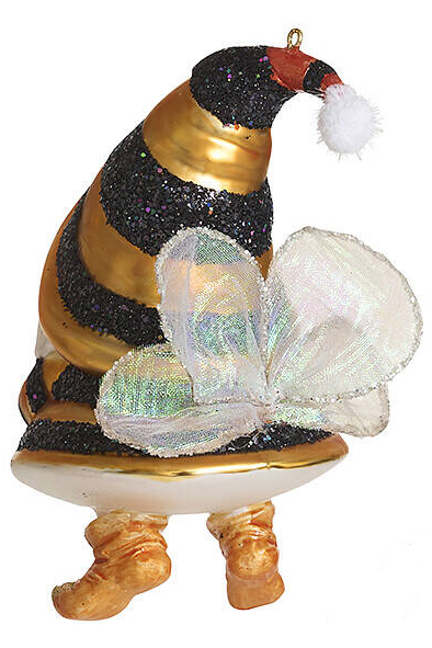 Ёлочное украшение Гном в костюме "Пчелка", выполнено из стекла, декорировано блёстками. Размер 9х7,5х14,5 см