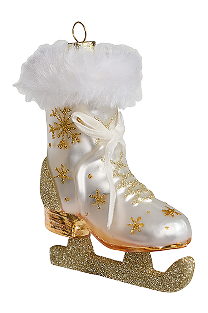 Елочное украшение, Конек фигурный с золотыми снежинками, декорировано блестками, выполнено из стекла. Размер 8,5х4,5х10 см