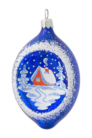 Фигурное украшение Прожектор Зима с оригинальной лункой выполнено из стекла, декорировано отрисовкой из глиттера. Для удобства подвешивания игрушка имеет ушко. Размер 12,5 см.