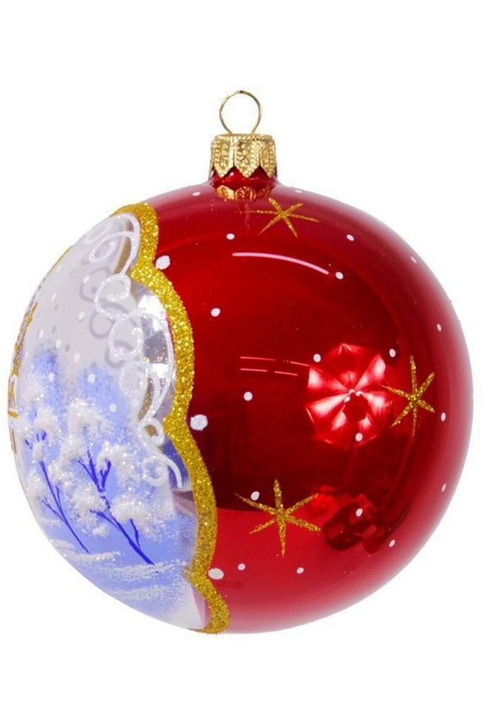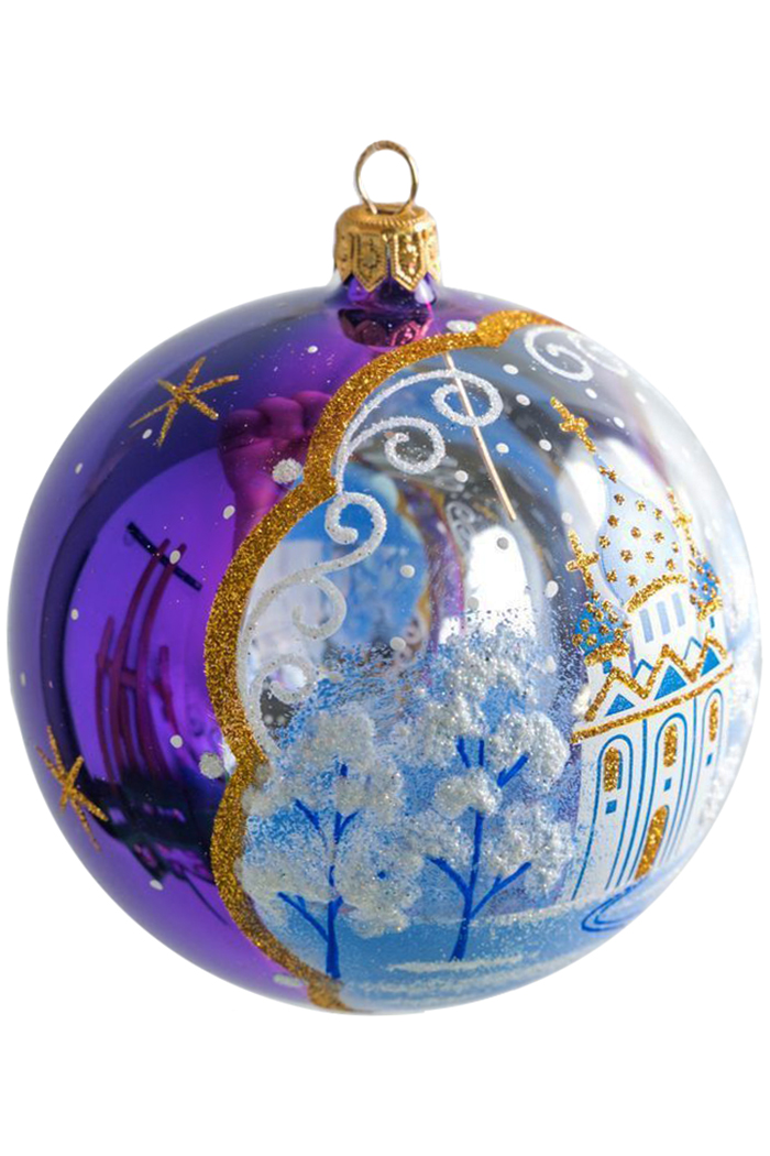 Шарик 9,5 см выполнен из стекла. Декорирован росписью, а также переливающейся крошкой (в зависимости от вида). Имеет ушко для ниточки или крючка. В индивидуальной упаковке.  Цвета в ассортименте.