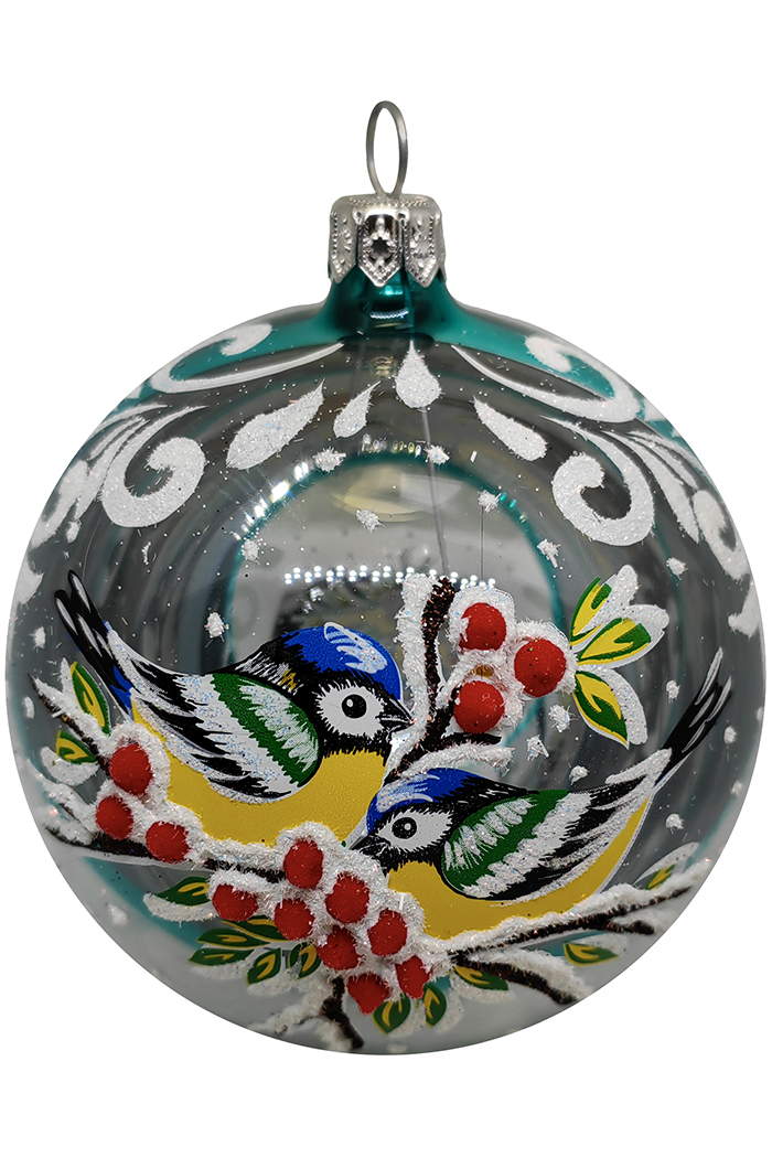 Шарик 9,5 см выполнен из стекла. Декорирован росписью, а также переливающейся крошкой (в зависимости от вида). Имеет ушко для ниточки или крючка. В индивидуальной упаковке. Цвета в ассортименте.