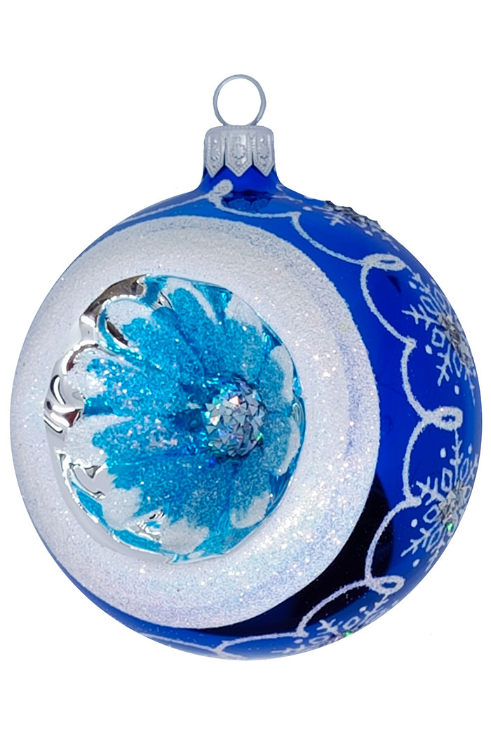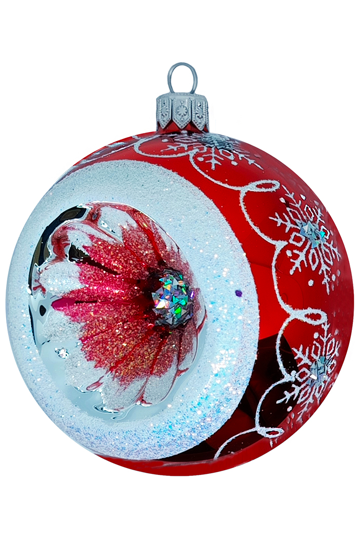Шарик 8,5 см выполнен из стекла. Декорирован росписью, а также переливающейся крошкой (в зависимости от вида). Имеет ушко для ниточки или крючка.