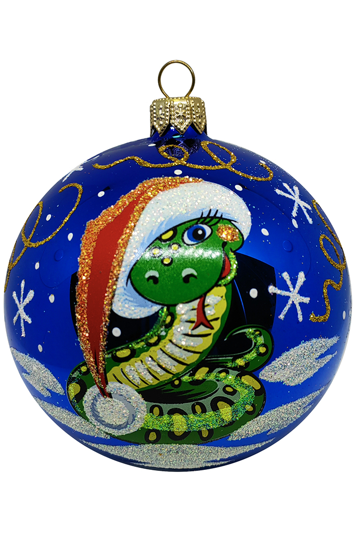 Шарик 8,5 см выполнен из стекла. Декорирован росписью в виде змеи, а также переливающейся крошкой. Украшение для удобства имеет ушко для ниточки или крючка. В индивидуальной упаковке. Цвета в ассортименте.
