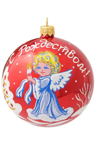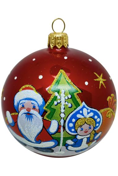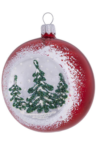 Шар выполнен из стекла в красном цвете с матовым покрытием и бархатной полоской с изображением ёлочек. Для удобства подвешивания игрушка имеет ушко и бархатную ленту. Диаметр 8см.