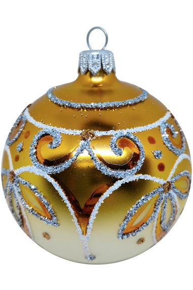 Шар выполнен из стекла в бежевом цвете, декорирован золотым узорчатым рисунком и глиттером. Для удобства подвешивания игрушка имеет ушко и бархатную ленту. Диаметр 10см.