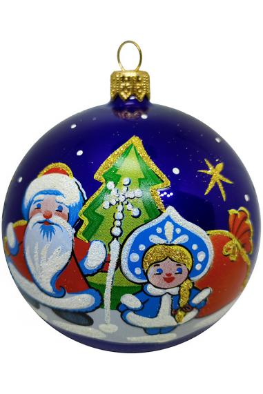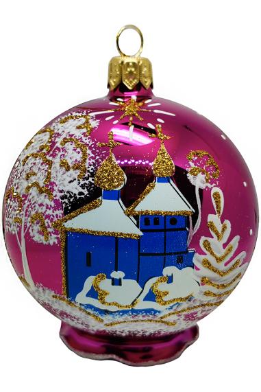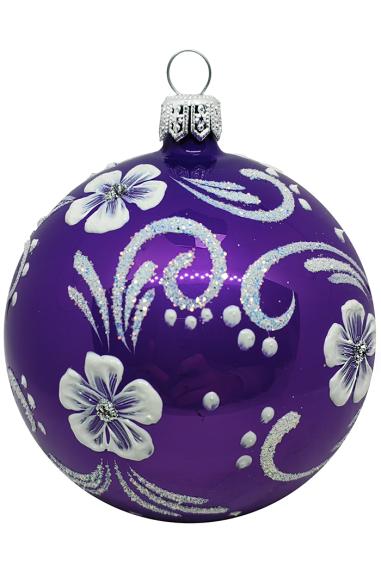 Шар выполнен из стекла в фиолетовом цвете с эффектом аквариум (блёстки внутри шара). Для удобства подвешивания игрушка имеет ушко и бархатную ленту. Диаметр 10см.