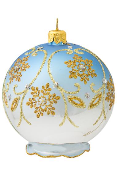 Шар выполнен из стекла в голубом цвете Тиффани с эффектом состаренности по объёмному узору. Для удобства подвешивания игрушка имеет ушко и бархатную ленту. Диаметр 8см.