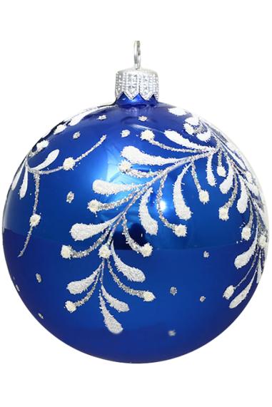 Шар выполнен из стекла в голубом цвете с эффектом аквариум и объемным витым рисунком внутри. Для удобства подвешивания игрушка имеет ушко и бархатную ленту. Диаметр 8см.