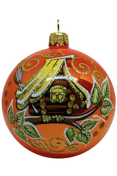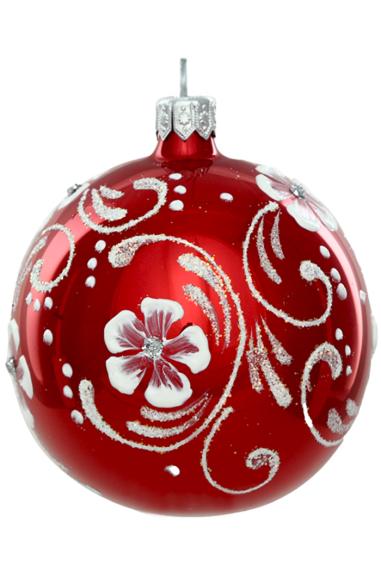 Шар выполнен из стекла в красном цвете с матовым покрытием, бархатный узор декорирован янтарными стразами. Для удобства подвешивания игрушка имеет ушко и бархатную ленту. Диаметр 8см.
