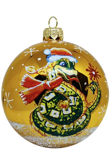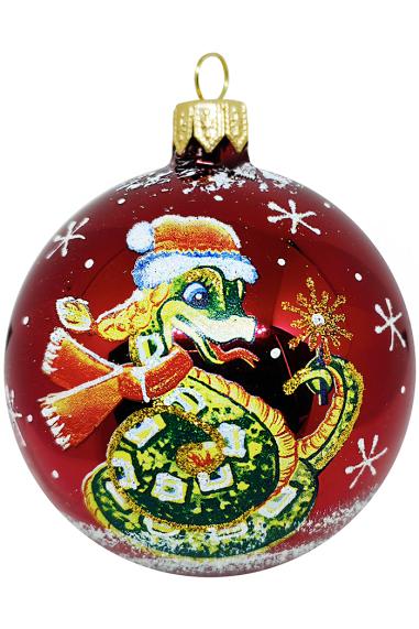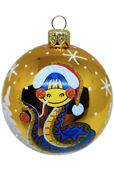 Шар 7,5 см выполнен из стекла. Декорирован росписью в виде змеи, а также переливающейся крошкой. Украшение для удобства имеет ушко для ниточки или крючка. В индивидуальной упаковке. Цвета в ассортименте.