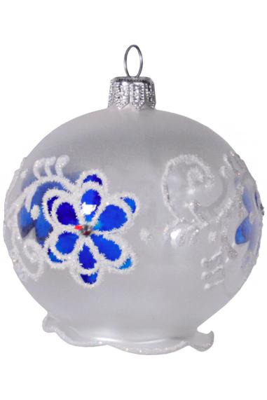 Стеклянный шар в голубом цвете, декорирован золотой росписью, переливающейся крошкой и жемчужинами. Для удобства подвешивания игрушка имеет ушко и бархатную ленту. Диаметр 10см.