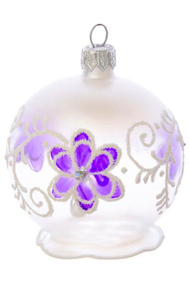 Многогранный Шар выполнен из стекла в фиолетовом цвете, декорирован переливающейся крошкой и жемчужинами. Для удобства подвешивания игрушка имеет ушко и бархатную ленту Диаметр 8см.