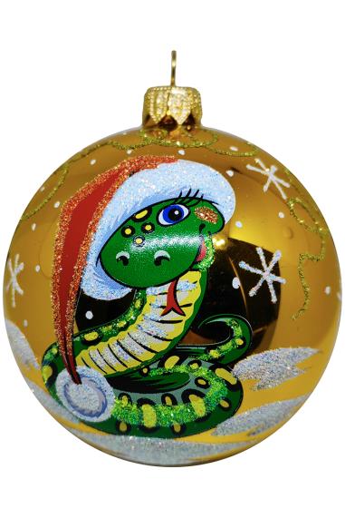 Шарик 8,5 см выполнен из стекла. Декорирован росписью в виде змеи, а также переливающейся крошкой. Украшение для удобства имеет ушко для ниточки или крючка. В индивидуальной упаковке. Цвета в ассортименте.