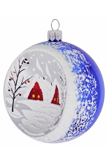 Шар выполнен из стекла в синем цвете, декорирован золотой росписью из переливающейся крошки. Для удобства подвешивания игрушка имеет ушко и бархатную ленту Диаметр 8см.