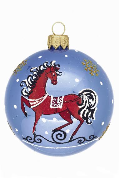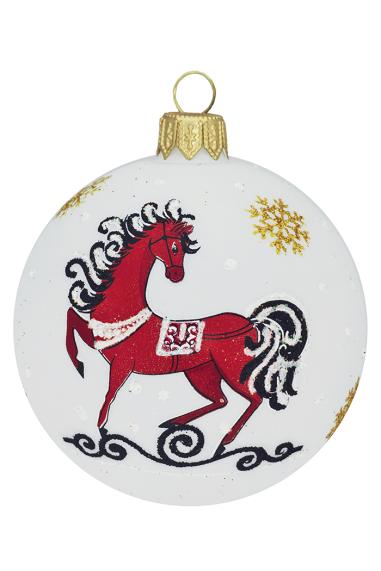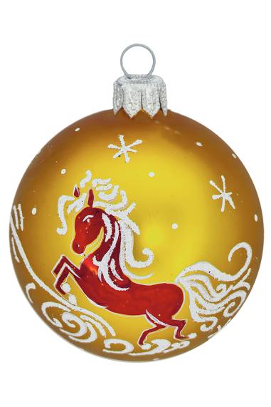 Шар 7,5 см выполнен из стекла, цвет матовый. Декорирован росписью в виде лошади, а также переливающейся крошкой. Украшение для удобства имеет ушко для ниточки или крючка. В индивидуальной упаковке. Цвета в ассортименте.