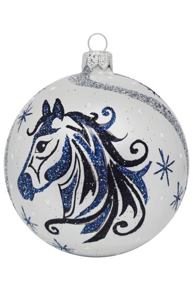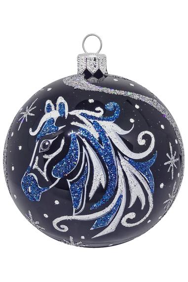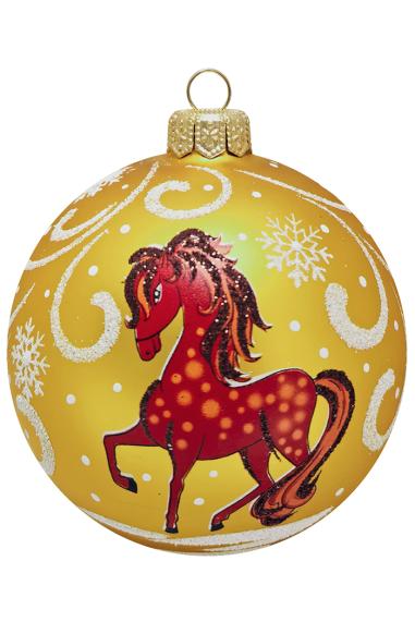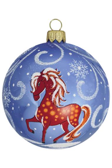 Шарик 8,5 см выполнен из стекла. Декорирован росписью в виде лошади, а также переливающейся крошкой. Украшение для удобства имеет ушко для ниточки или крючка. В индивидуальной упаковке. Цвета в ассортименте.