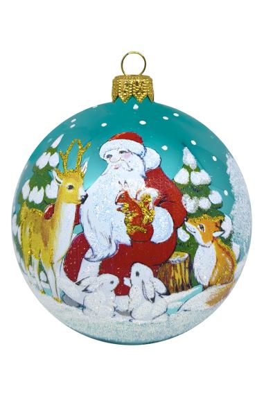 Шар выполнен из фактурного стекла в тёмно-зеленом цвете с эффектом состаренности, декорирован золотой переливающейся крошкой. Для удобства подвешивания игрушка имеет ушко и бархатную ленту. Диаметр 10см.
