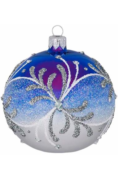 Шар с объёмными выдутыми долькам по краю, усыпанными серебряными блестками. Выполнен из стекла в голубом цвете. Для удобства подвешивания игрушка имеет ушко и бархатную ленту. Диаметр 10см.