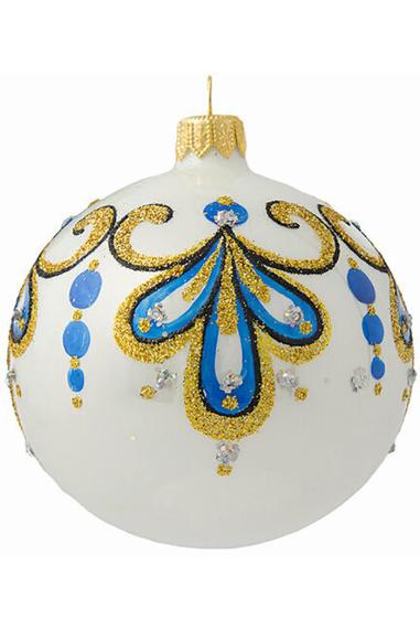 Шар выполнен из стеклопластика, с бархатной поверхностью синего цвета, декорирован золотым орнаментом, стразами и крупными камнями. Для удобства подвешивания игрушка имеет ушко и веревочку. Диаметр 10см.