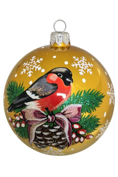 Шар выполнен из стекла с эффектом аквариума и витым рисунком в золотом цвете. Для удобства подвешивания игрушка имеет ушко и бархатную ленту. Диаметр 10см.