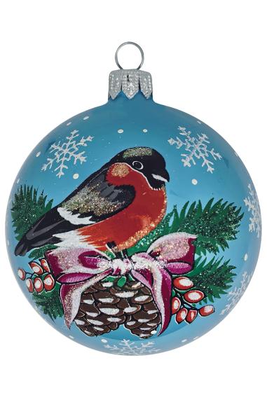 Шар выполнен из стекла в красно-белом цвете с классической рождественской росписью, стразы дополняют образ имитируя ягодки на рисованных листочках. Для удобства подвешивания игрушка имеет ушко и бархатную ленту. Диаметр 10см.