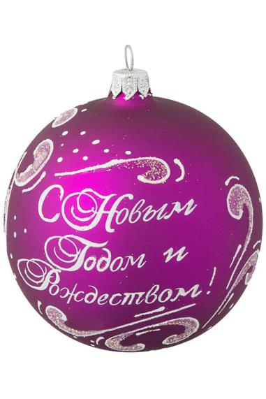 Шар выполнен из стекла в фиолетовом цвете, декорирован золотой крошкой, бархатной лентой и жемчужинами. Для удобства подвешивания игрушка имеет ушко и бархатную ленту. Диаметр 8см.