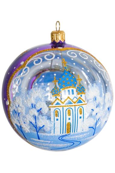 Шар выполнен из стеклопластика в темно-фиолетовом цвете с орнаментом из переливающихся камней, страз, бисера и зеркальных элементов. Для удобства подвешивания игрушка имеет ушко и ленту. Диаметр 9см.