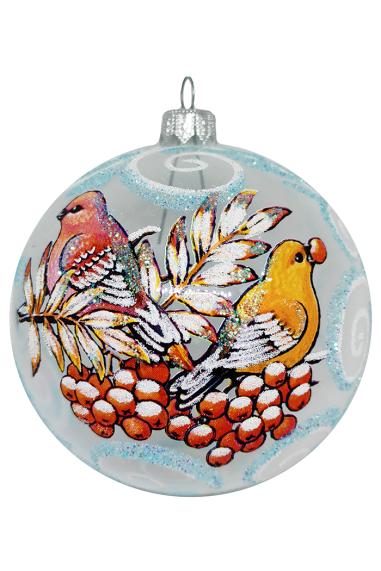 Шарик 7,5 см выполнен из стекла. Декорирован росписью, а также переливающейся крошкой (в зависимости от вида). Имеет ушко для ниточки или крючка. В индивидуальной упаковке. Цвета в ассортименте.
