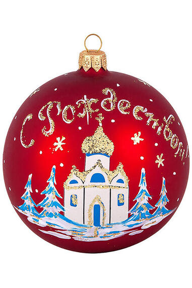 Яркий многогранный стеклянный шар в красном цвете с эффектом состаренного стекла, декорирован золотой росписью и зелёными стразами. Для удобства подвешивания игрушка имеет ушко и бархатную ленту. Диаметр 8см.