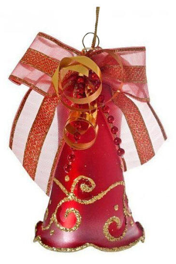 Фигурное украшение Подвеска выполнена из стекла в красном цвете, декорировано завитками из золотого глиттера и оттеняющими серебряными стразами. Для удобства подвешивания игрушка имеет ушко и бархатную ленту. Размер 16см.
