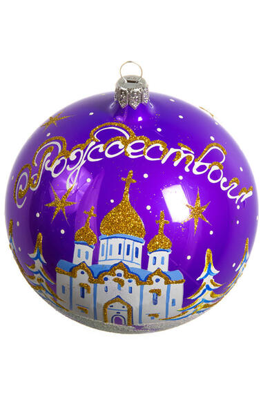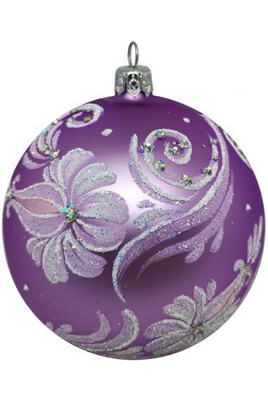 Шар выполнен из стеклопластика в темно-фиолетовом цвете с орнаментом из переливающихся камней, страз, бисера и зеркальных элементов. Для удобства подвешивания игрушка имеет ушко и ленту. Диаметр 9см.