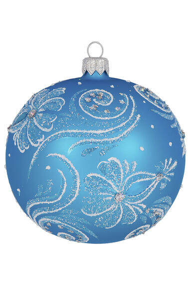 Шар выполнен из стеклопластика в синем цвете, декорирован зеркальными вставками и бусинками. Для удобства подвешивания игрушка имеет ушко. Диаметр 9см.