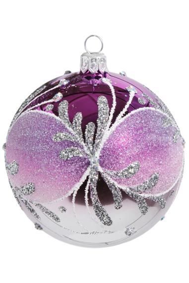 Шар выполнен из стекла в фиолетовом цвете, декорирован золотой крошкой, бархатной лентой и жемчужинами. Для удобства подвешивания игрушка имеет ушко и бархатную ленту. Диаметр 8см.