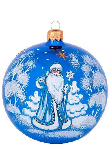 Шар выполнен из стекла в синем цвете, декорирован серебряными листочками из переливающейся крошки. Для удобства подвешивания игрушка имеет ушко и бархатную ленту. Диаметр 10см